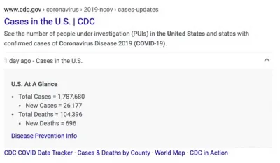 In Connecting Americans to Coronavirus Information Online, “The White House Office of Science and Technology Policy (OSTP) and Office of Management and Budget (OMB) directed Federal Chief Information Officers to incorporate these new Schema.org standard tags into all federally maintained web pages related to COVID-19.” When a government web page that announces information about our coronavirus pandemic response includes SpecialAnnouncement markup, it will help search engines fine-tune their support for our information. And, having markup on your pages now means that they are ready for special treatment in results pages.