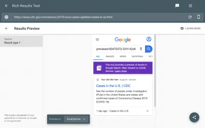 Search engines provide validation tools for structured data. These tools allow you to submit a url for a web page, and then test to see if the code is correct for the types of structured data that the search engine supports. If there’s a problem, they can give you some clues on how to fix it. The Bing tool requires a Bing Webmaster Tools account. The Google rich results tester does not have such a requirement. Both tools know to look for and check SpecialAnnouncement. Google’s rich results tester now provides a preview of the rich result too. The style does not match what we are seeing in actual search results, but the structure, interactivity, and text are the same.