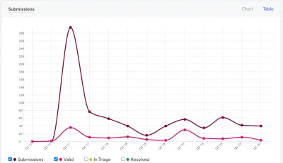 Volume — When a new system is added, there tend to be more reports up front, which then decreases to a more steady state. To mitigate that volume, we throttle the reports by starting systems out in a private bug bounty, which is only available to a small number of security researchers. (There are other ways to do this throttling—that’s just what works for us.) We also have a setting for signaling, a means of identifying hackers who have had consistently valid reports, so that we receive reports from more vetted researchers. After a time, we move systems to the public program to make it available to anyone to submit. We then increase the bounty rewards over time, to incentivize researchers to continue to investigate our systems.