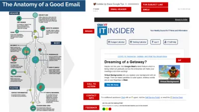 Every Thursday, the GSA IT team sends agency-wide messages with three to four short technology tips for employees. The messages are short, so employees can quickly scan the newsletter to find topics that are of interest to them. When the team noticed that readership began to level off around two years ago, the weekly email got a rebrand. A good way to think about all the various components that make for good email is to think about its parts.