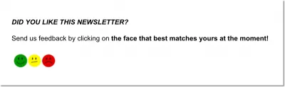 A screen capture of the feedback section at the end of the email has three lines. The first two are text which says, Did you like this communication? Send us feedback by clicking on the face that best matches yours at the moment! The third line has 3 face