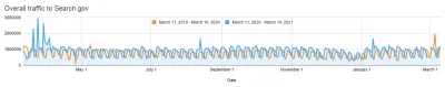 When comparing traffic from March 11, 2020 (the day the WHO declared COVID-19 a pandemic) to March 10, 2021 against the year before it (from March 12, 2019 to March 10, 2020, because 2020 was a leap year), the overall visits to federal websites that participate in the DAP increased by a staggering 57%, from about 14.82 billion to about 23.33 billion.
