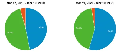 In the year prior to COVID-19 being declared a pandemic, desktop traffic (PCs and laptops) slightly edged mobile traffic to federal government websites, about 49% to 47% respectively, and with tablets contributing to 4% of the share of visits (left pie chart below). In the year since COVID-19 was declared a pandemic, mobile devices became the dominant technology used to access federal websites, by about a 55% to 43% ratio, and tablets dropped to nearly 3% (right pie chart below).