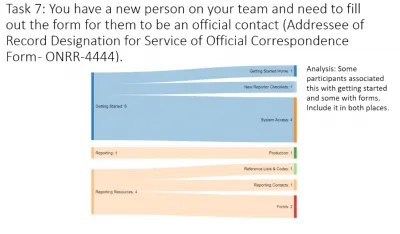 Then we had several tasks where participant responses diverged significantly. These tasks included how to set up a new team member, how to find information on the site, and how to find help with ONRR reporting and paying systems. The diagram below shows that participants were divided on whether to go to the Getting Started category or Reporting Resources main categories to add a new team member as a contact. The responses further diverged within the subcategories as some participants were looking for a specific form and some thought it would be in Getting Started. Our solution to this and similar issues will be to include the needed resource in more than one category.