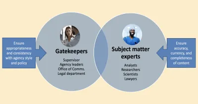 Gatekeepers ensure tone appropriateness and consistency with agency style and policy in their reviews. A subject matter expert will ensure the content's accuracy, currency, and completeness.