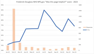 Using DAP data, we have long known that traffic on the Frederick Douglass NHS site spikes in February — Black History Month. With that information alone, we might conclude that people are interested in Frederick Douglass that time of year. On its own, that fact seems like a win for the National Park Service. We had assumed that if we have good information on Frederick Douglass and many people view that page, we’re doing our job. As it turned out, the spike in traffic had a corresponding spike in survey responses — responses that tended to be more negative than the rest of the year, dragging the overall score down.