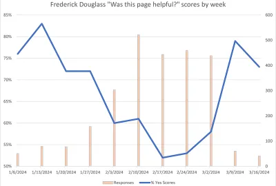 As we rolled out the changes to make the biographical information easier to find, the score began to inch upward. Weekly scores were between 53% and 61% for the following weeks. While these were still not ideal scores, it was encouraging to have been able to use the data to identify the problem area and at least push things in the right direction. As soon as Black History Month was in the rearview mirror, the score returned to its usual range between 75 and100% satisfaction as the core audience of national park visitors once again made up the majority of visitors to the website.