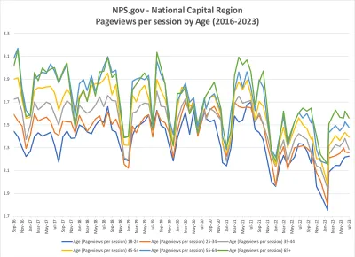 Consider your own browsing behavior. Are you more likely to look around or more likely to hit the “back” button when you don’t immediately find what you were looking for? The data show that younger people tend to bounce more often than older people. The chart below tracks pageviews per session by age group from 2016 to 2023.